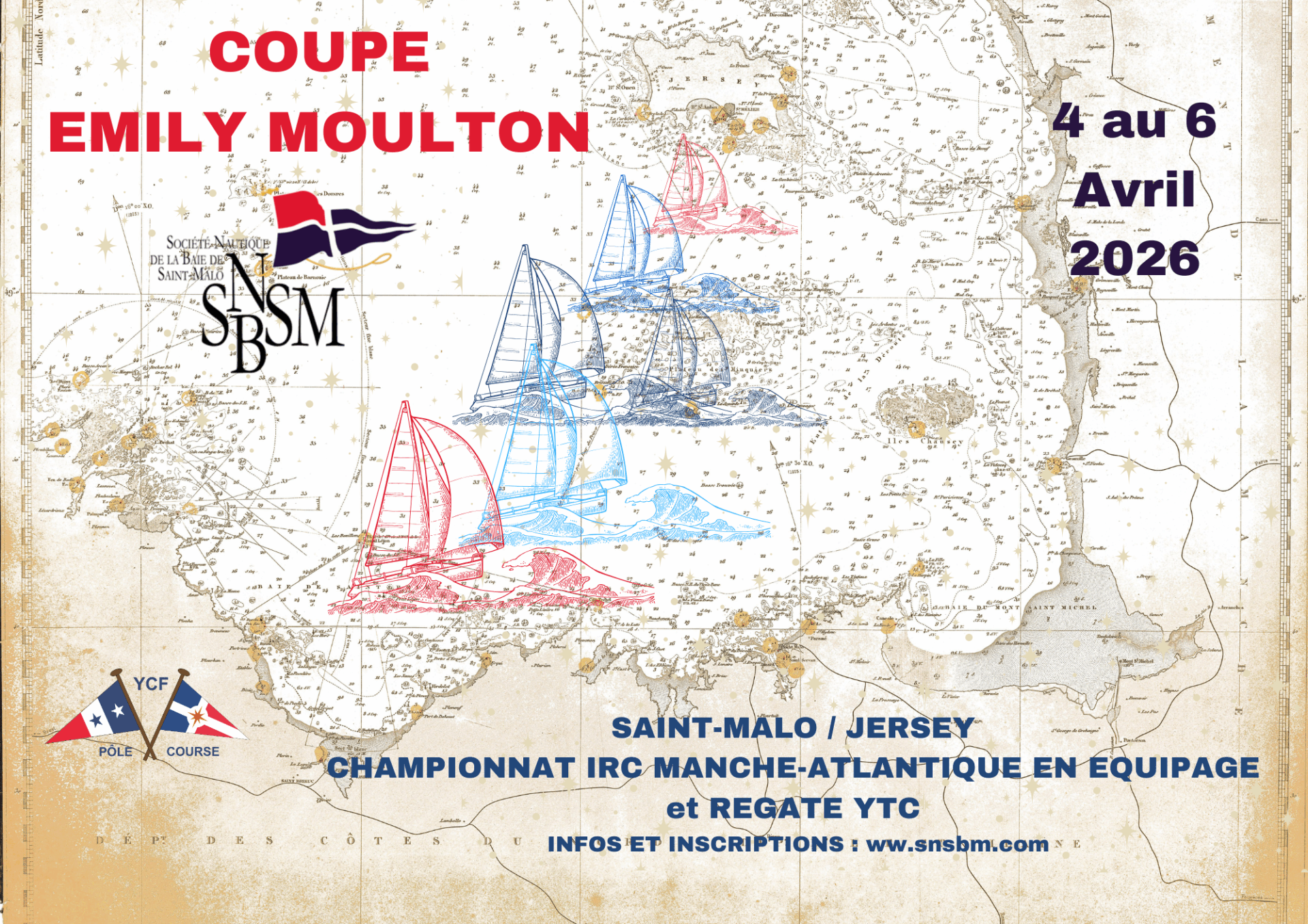 La Société Nautique de la Baie de Saint Malo, dans la dynamique de l’ouverture de la saison voileuse en Bretagne Nord, en assure l’organisation le WE de Pâques du 04 au 06 avril en collaboration amicale avec les Anglo-Normands du St Helier Yacht Club et du Royal Channnel Islands Yacht Club de Jersey. La Coupe Emily Moulton est immédiatement précédée des régates Commodore’s Cup et Cook Salver arrivant le 03 avril à Saint Malo depuis Jersey.