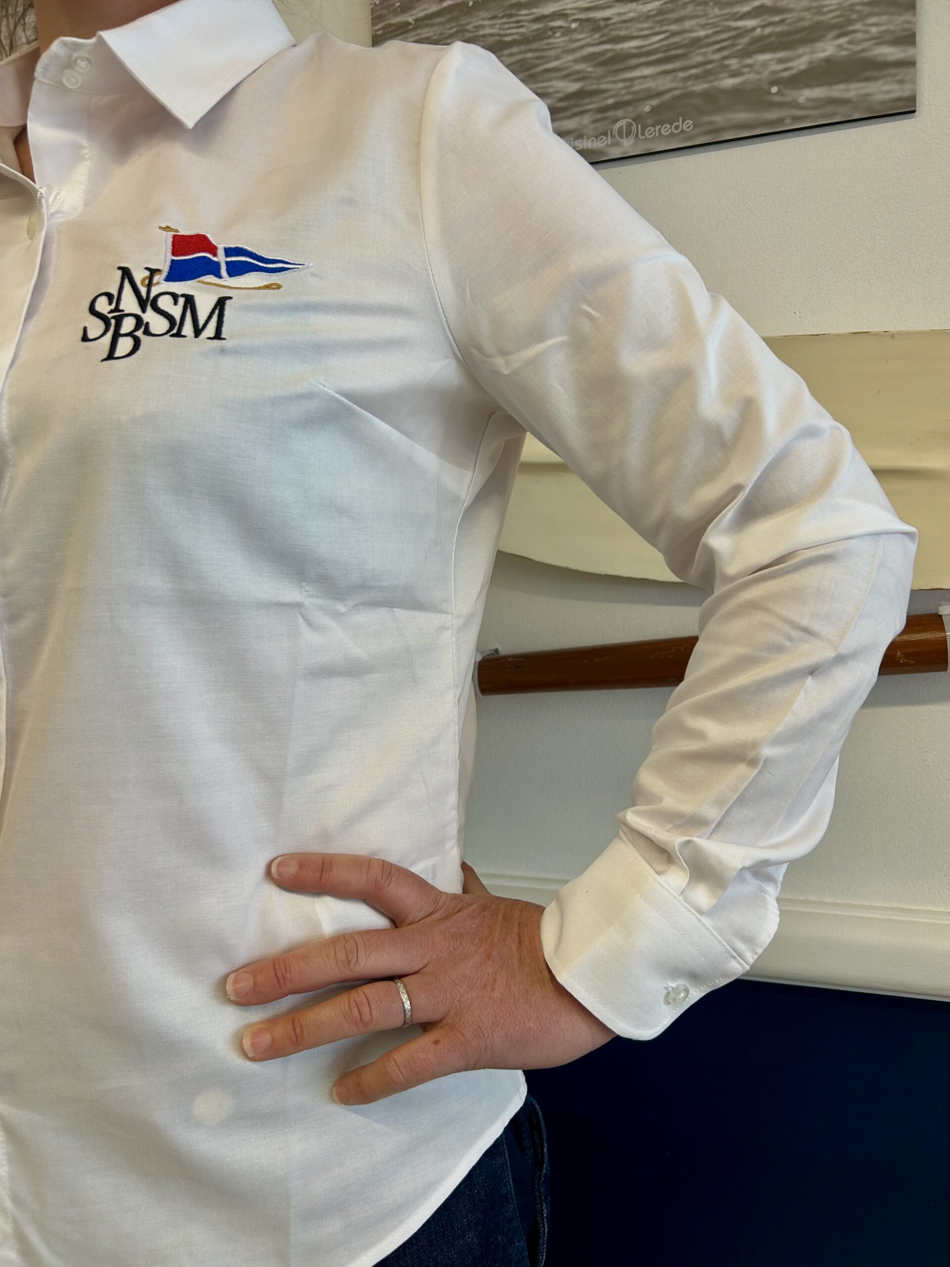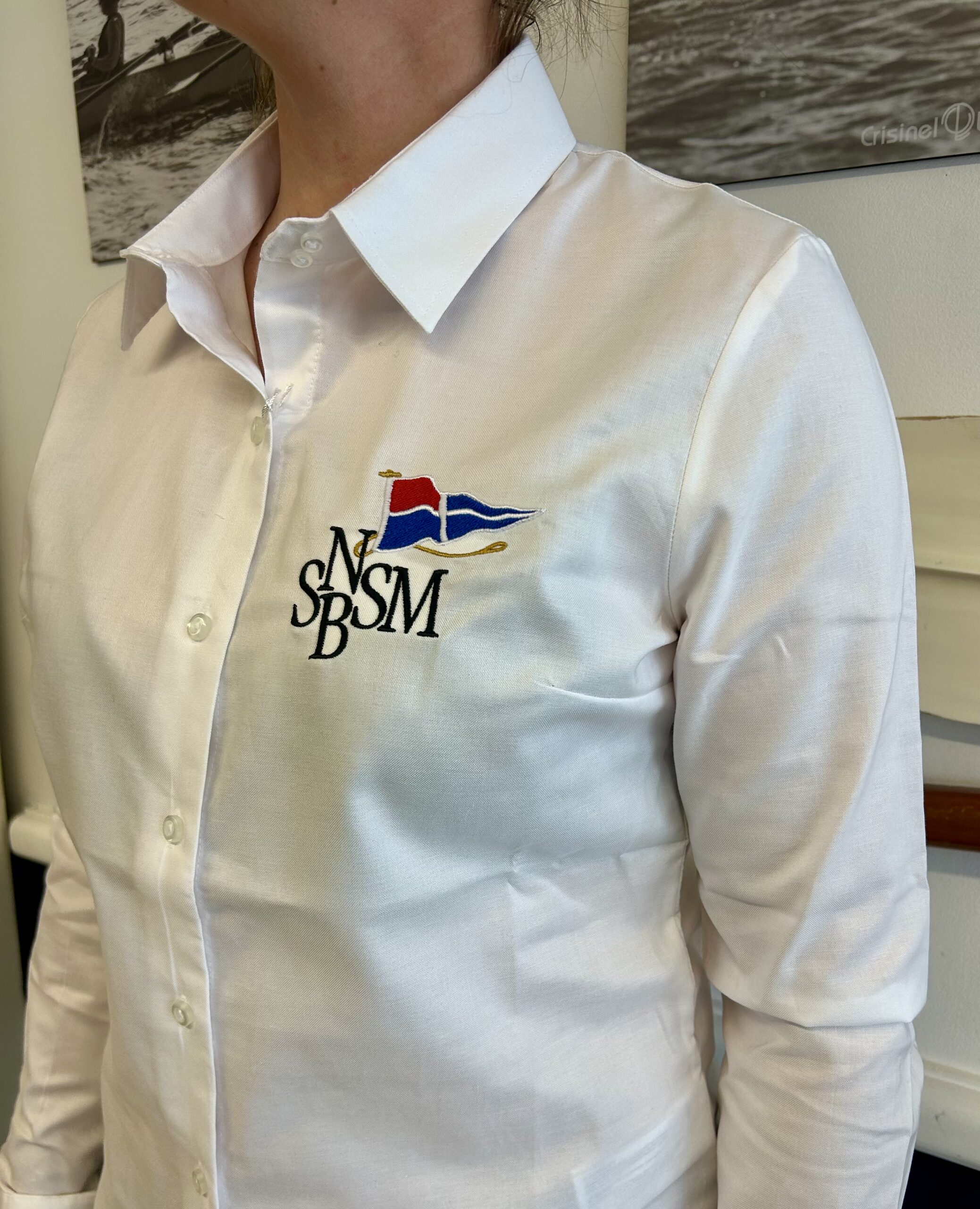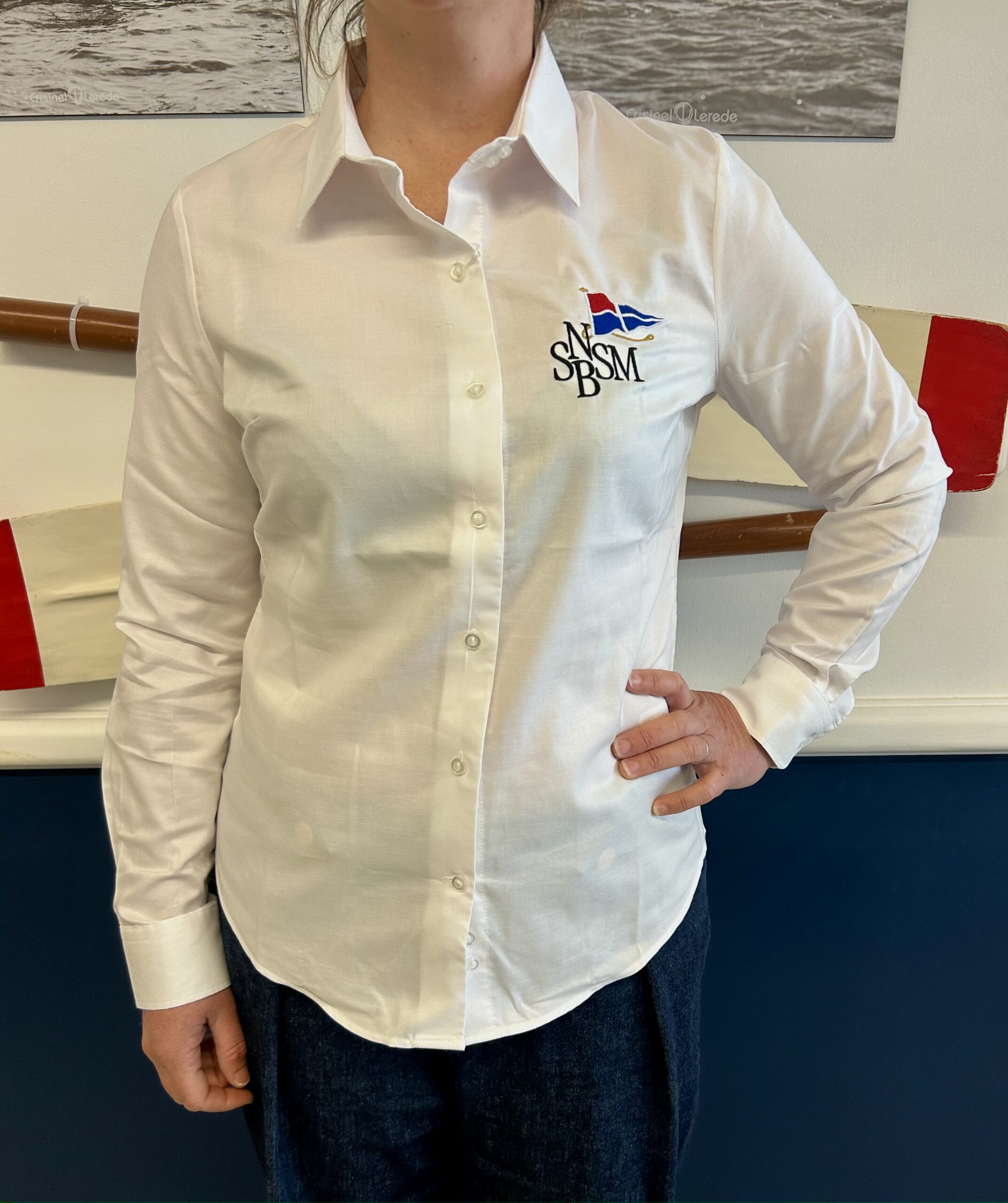 Chemise blanche femme en 100% coton à coupe moderne ajustée. Col américain boutonné, poignets à patte capucin, logo SNBSM brodé et poche poitrine.